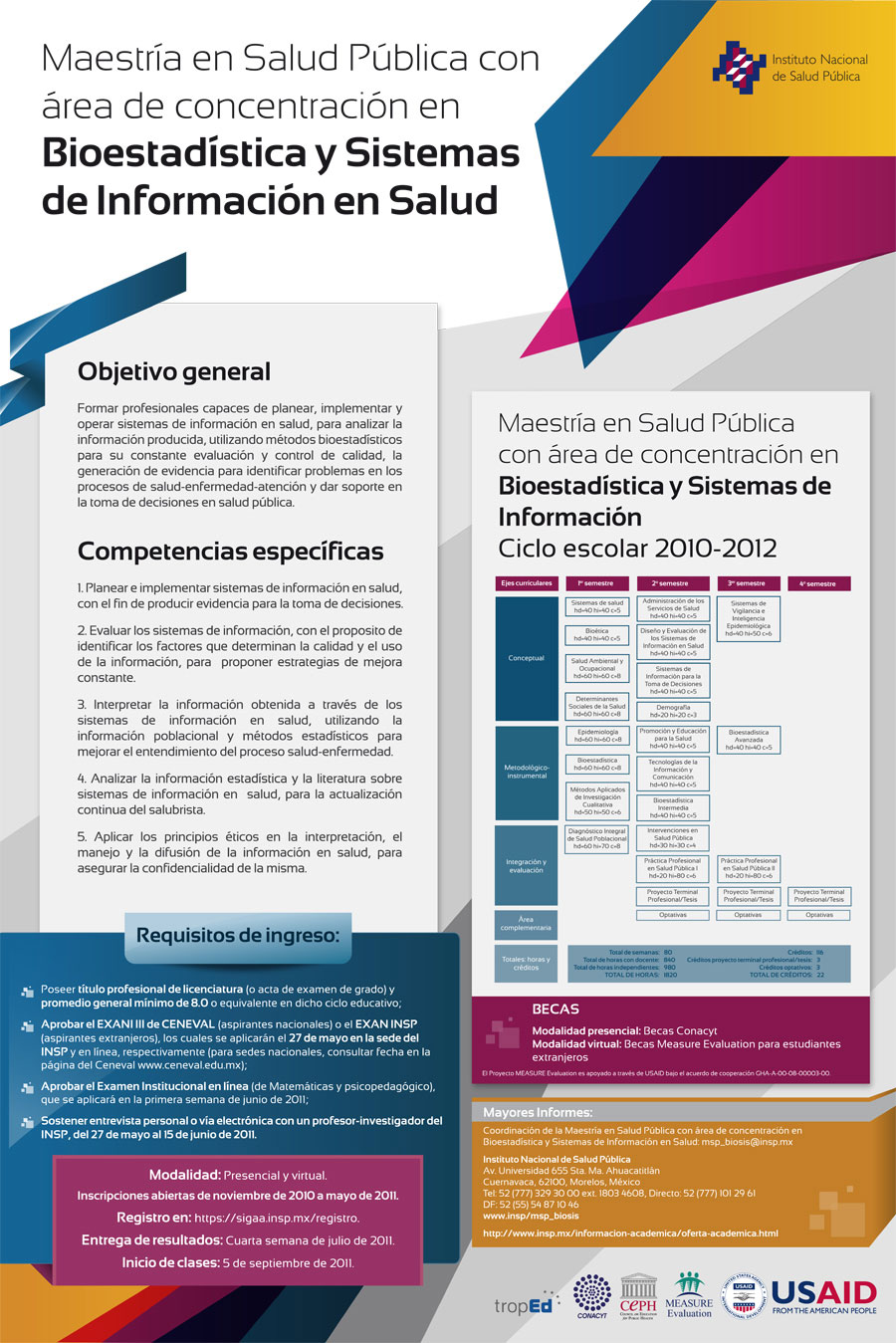 Por todo lo anterior, en el Instituto Nacional de Salud Pública se ha desarrollado el programa de Maestría en Salud Pública con área de concentración en Bioestadística y Sistemas de Información en Salud, cuya importancia se basa en la necesidad de combinar y poner en práctica los métodos estadísticos y los conocimientos en sistemas de información en salud necesarios para generar la evidencia que de sustento a la toma de decisiones en salud pública.