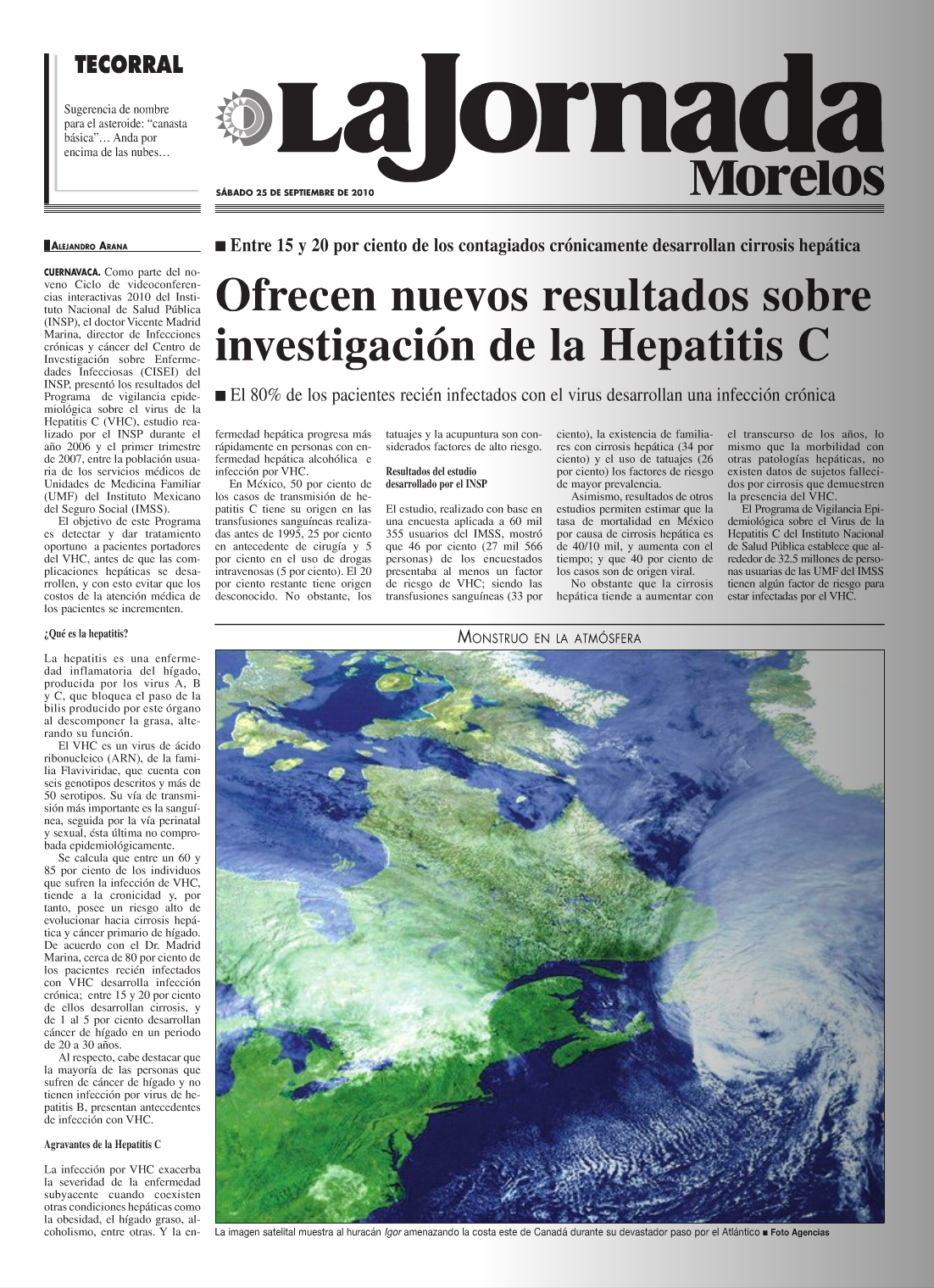 Como parte del noveno Ciclo de videoconferencias interactivas 2010 del Instituto Nacional de Salud Pública (INSP), el doctor Vicente Madrid Marina, director de Infecciones crónicas y cáncer del Centro de Investigación sobre Enfermedades Infecciosas (CISEI) del INSP, presentó los resultados del Programa de vigilancia epidemiológica sobre el virus de la Hepatitis C (VHC), estudio realizado por el INSP durante el año 2006 y el primer trimestre de 2007, entre la población usuaria de los servicios médicos de Unidades de Medicina Familiar (UMF) del Instituto Mexicano del Seguro Social (IMSS). El objetivo de este Programa es detectar y dar tratamiento oportuno a pacientes portadores del VHC, antes de que las complicaciones hepáticas se desarrollen, y con esto evitar que los costos de la atención médica de los pacientes se incrementen. La hepatitis es una enfermedad inflamatoria del hígado, producida por los virus A, B y C, que bloquea el paso de la bilis producido por este órgano al descomponer la grasa, alterando su función. El VHC es un virus de ácido ribonucleico (ARN), de la familia Flaviviridae, que cuenta con seis genotipos descritos y más de 50 serotipos. Su vía de transmisión más importante es la sanguínea, seguida por la vía perinatal y sexual, ésta última no comprobada epidemiológicamente. Se calcula que entre un 60 y 85 por ciento de los individuos que sufren la infección de VHC, tiende a la cronicidad y, por tanto, posee un riesgo alto de evolucionar hacia cirrosis hepática y cáncer primario de hígado. De acuerdo con el Dr. Madrid Marina, cerca de 80 por ciento de los pacientes recién infectados con VHC desarrolla infección crónica; entre 15 y 20 por ciento de ellos desarrollan cirrosis, y de 1 al 5 por ciento desarrollan cáncer de hígado en un periodo de 20 a 30 años. Al respecto, cabe destacar que la mayoría de las personas que sufren de cáncer de hígado y no tienen infección por virus de hepatitis B, presentan antecedentes de infección con VHC. |